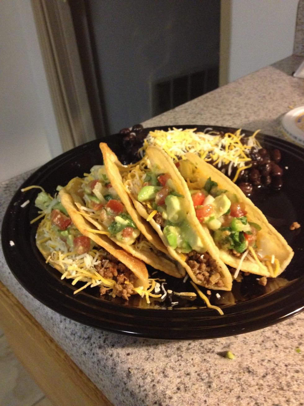 Once shells and meat are done. Layer ingredients. I put a little sour cream on the bottom, then meat, then cheese, then our avocado salsa. If your family doesn't eat this, then I've got nothin'! 😊