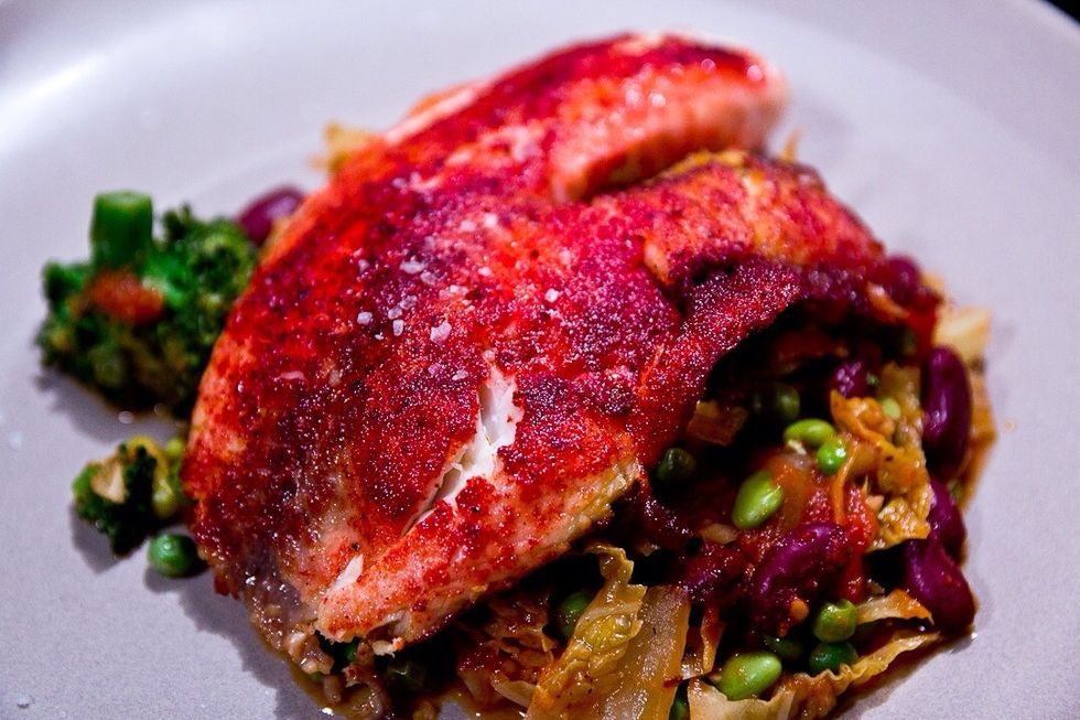 Simple seared fish over an explosion of beans, peas, cabbage, broccoli and tomatoes