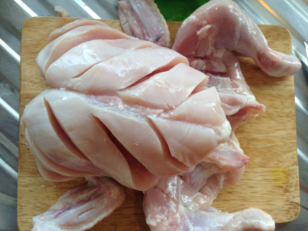 Take out the guts from inside the backbone (red stuff). Reason I take it out is because if you are going to keep the chicken for more than a day, it will not smell.