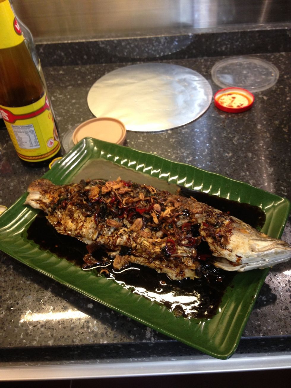 Retain some oil in the deep frying pan. Keep fish aside and cook sauce next