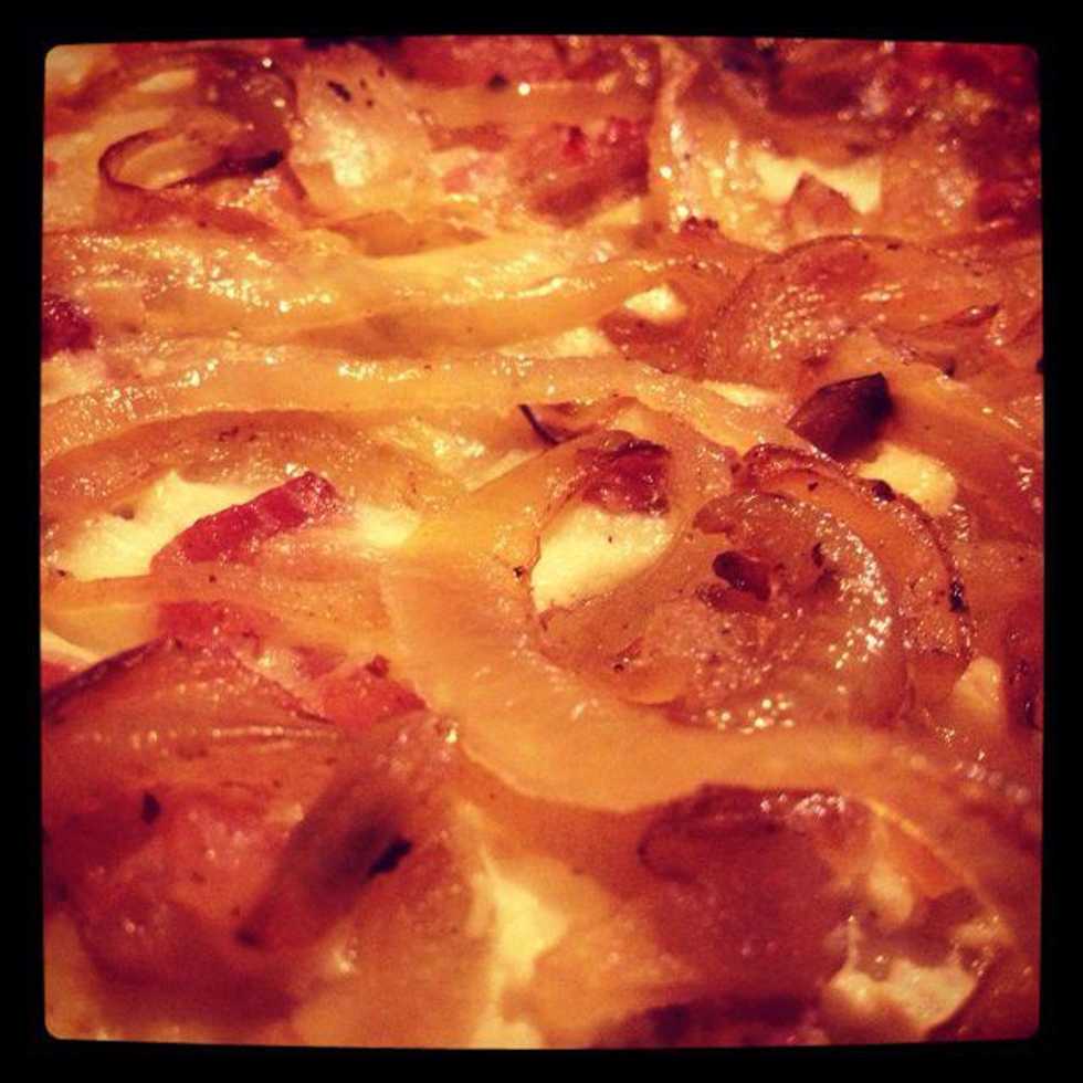Spread dough. Mix the fromage blanc with the crème fraîche and season. Fry the bacon and the onions.