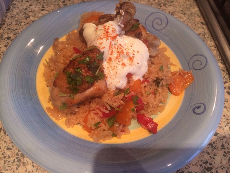 Frozen chicken stock and tomato sauce. You can use stock cube and boiling water if you like.
