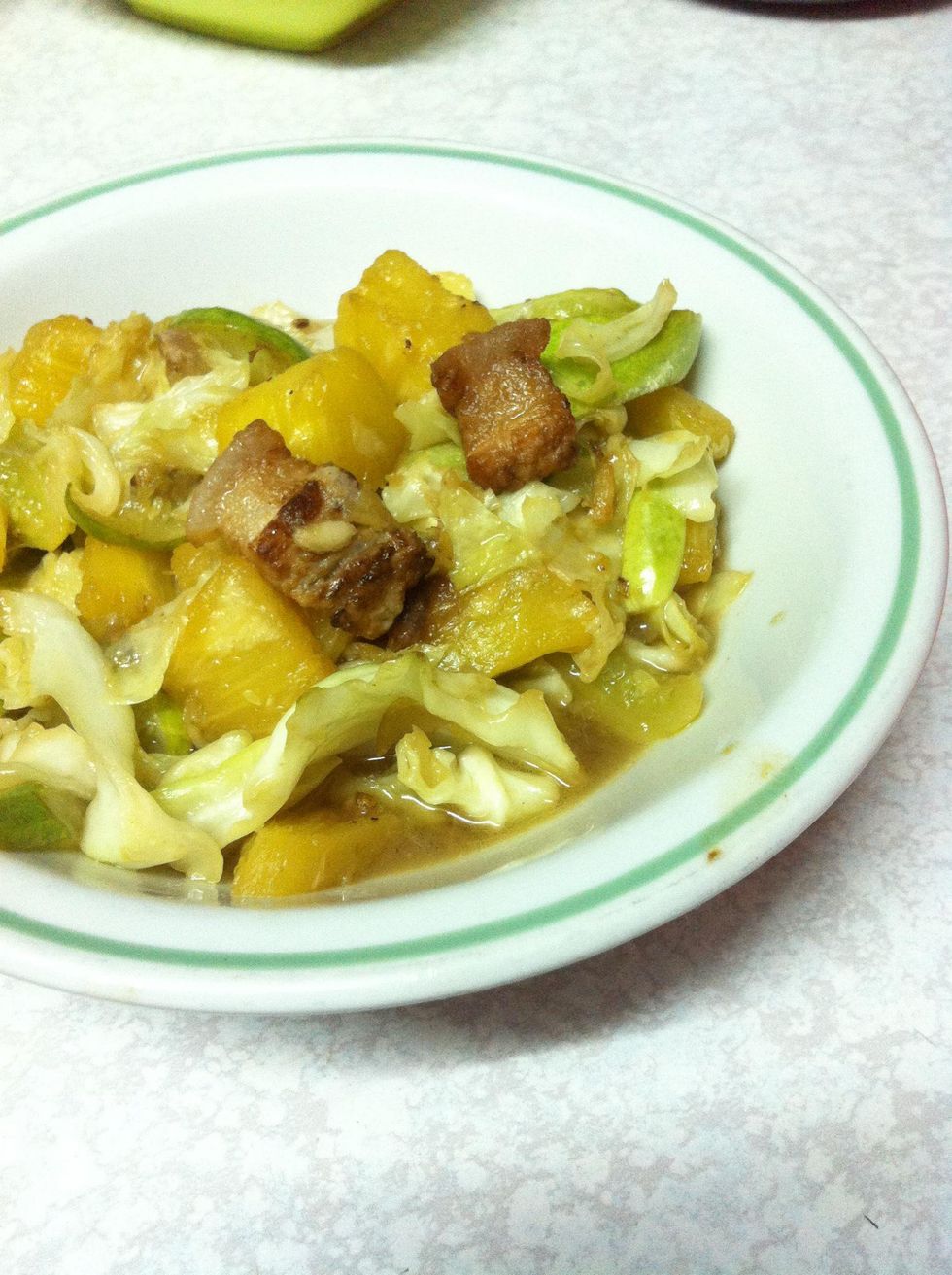 1/2part Pile apple สัปะรด3.0part Cucumber แตงกวา1/2part Turnip ผักกาด0.4kg Streaky pork หมูสามชั้น0.5Tbsp Garlic กระเทียม2.0Tbsp Oyster sauce ซอสหอยนางรม1.0Tbsp Thai salt sauce ซอสภูเขา1.0Tbsp Fish sauce1.0Tbsp Sugar1.0c Water1/2Tbsp Oil
