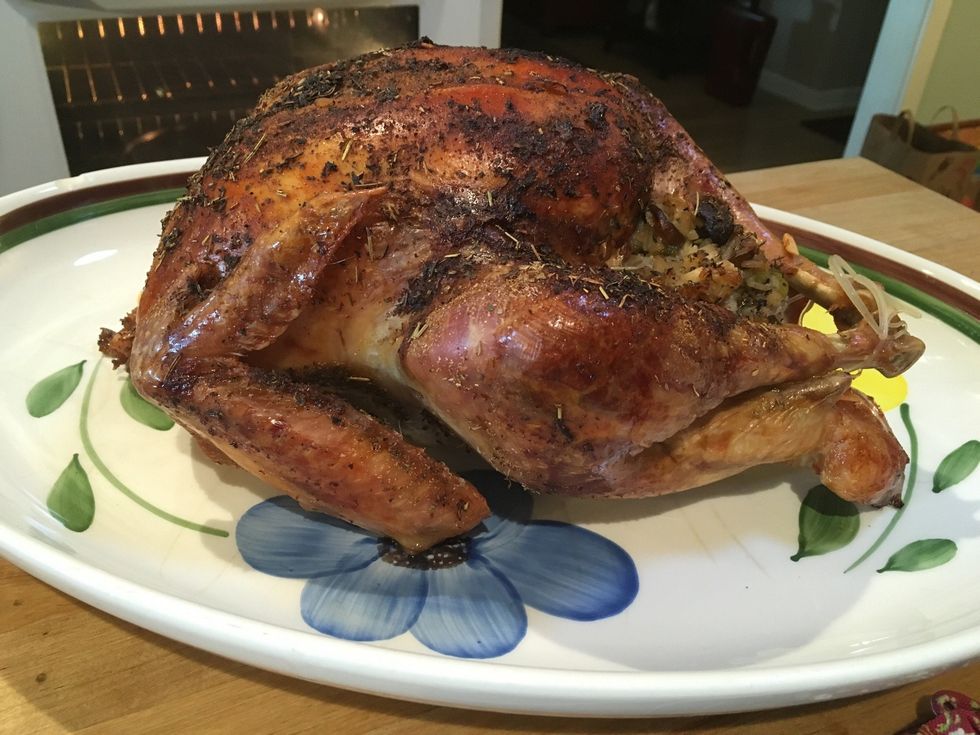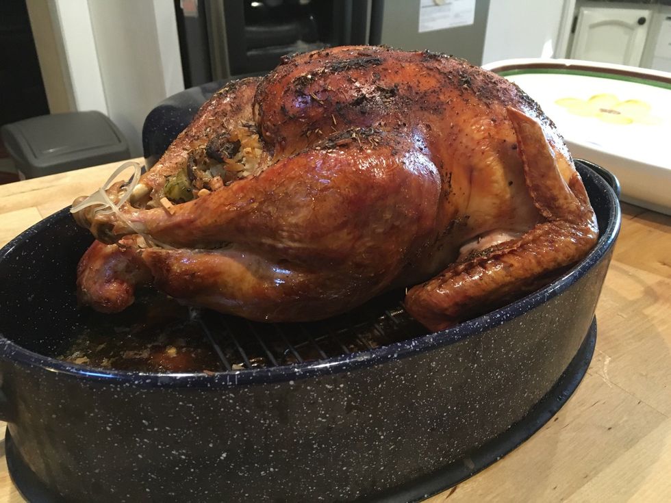 My turkey tray came with a topper. You don't have to do this but it makes the turkey not as burnt. I also put tin foil over the turkey.