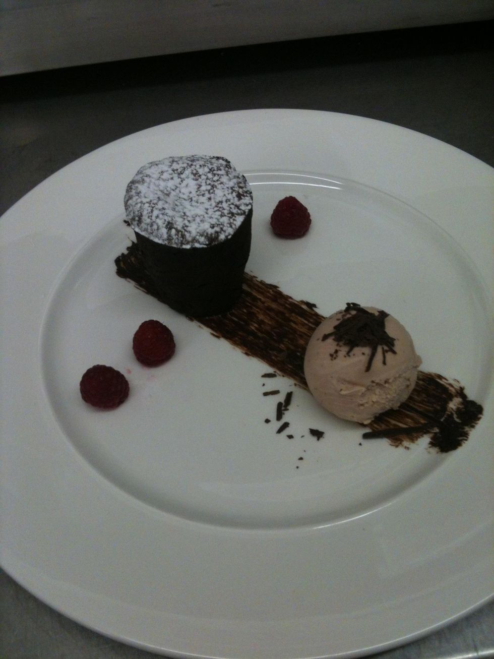 Melt butter and choc over Bain Marie, whisk eggs and sugar unil pale, combine the two slowly, fold in the flour, put into buttered and cocoed moulds. Cook at 180 for 8 mins. Wa la!!!
