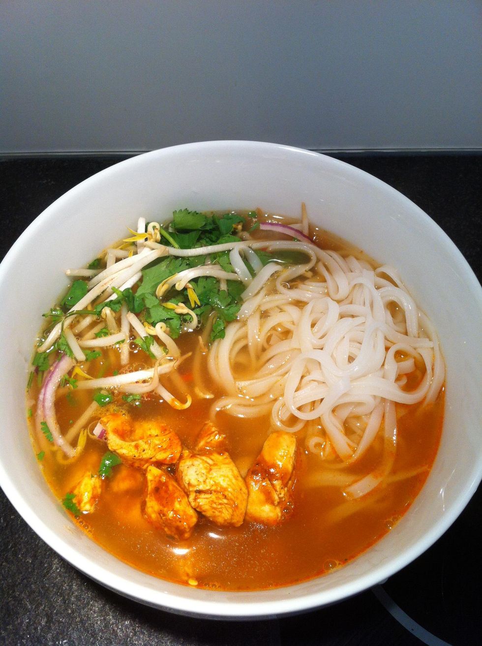 By now the water should cook. Add the rice noodles and cook them according the instructions on the box.