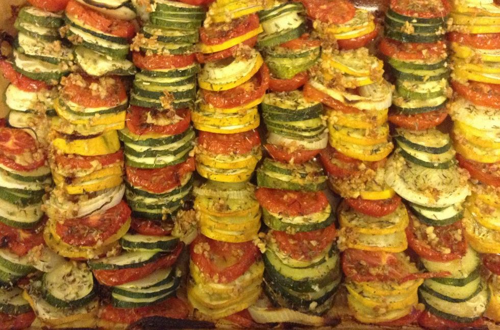 Put all veggies slices .. Up to u how u organize them... I go one line zuchini, one line squash.. And put tomatoes and onions in between