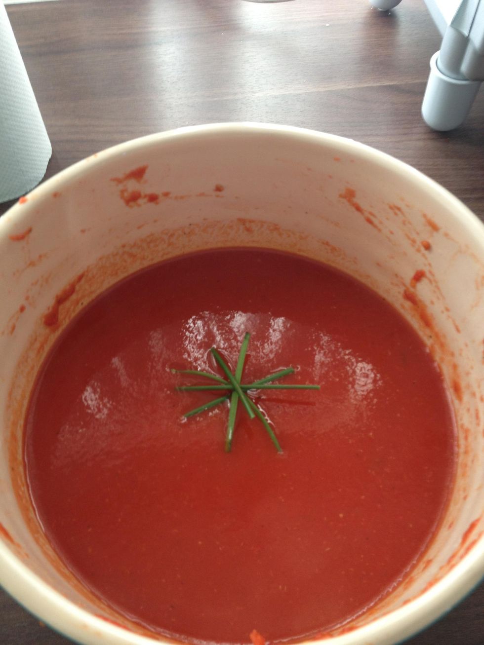 Sieve, really push it through all that should be left is seeds and thick cellulose strands from the toms. Use a clean spoon to scrape bottom of sieve to avoid seeds falling in to soup. Push that pulp.