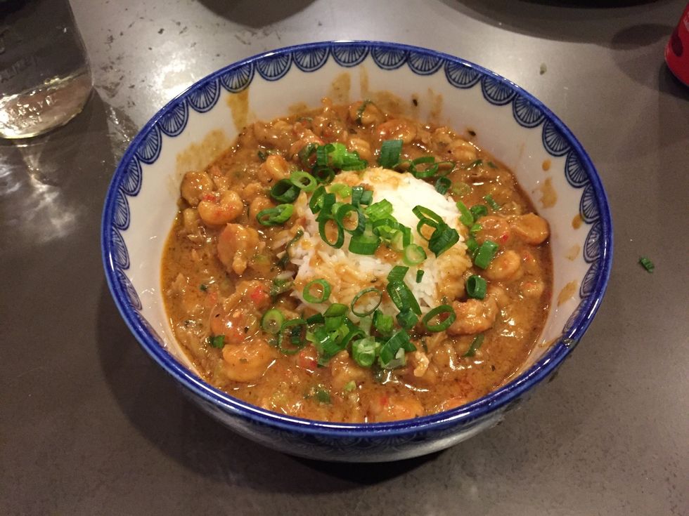 Make a small mound of white jasmine or long grain rice in the middle of a wide bowl and ring with étouffée. Top with green onions.