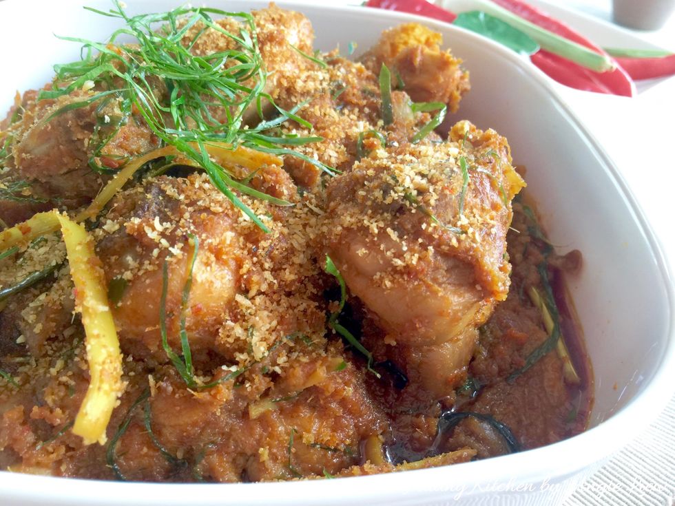 Dish out onto a serving casserole garnish with finely shred turmeric leaves and kerisik for added flavour. For more details, visit http://www.huangkitchen.com/traditional-malaysian-chicken-rendang/