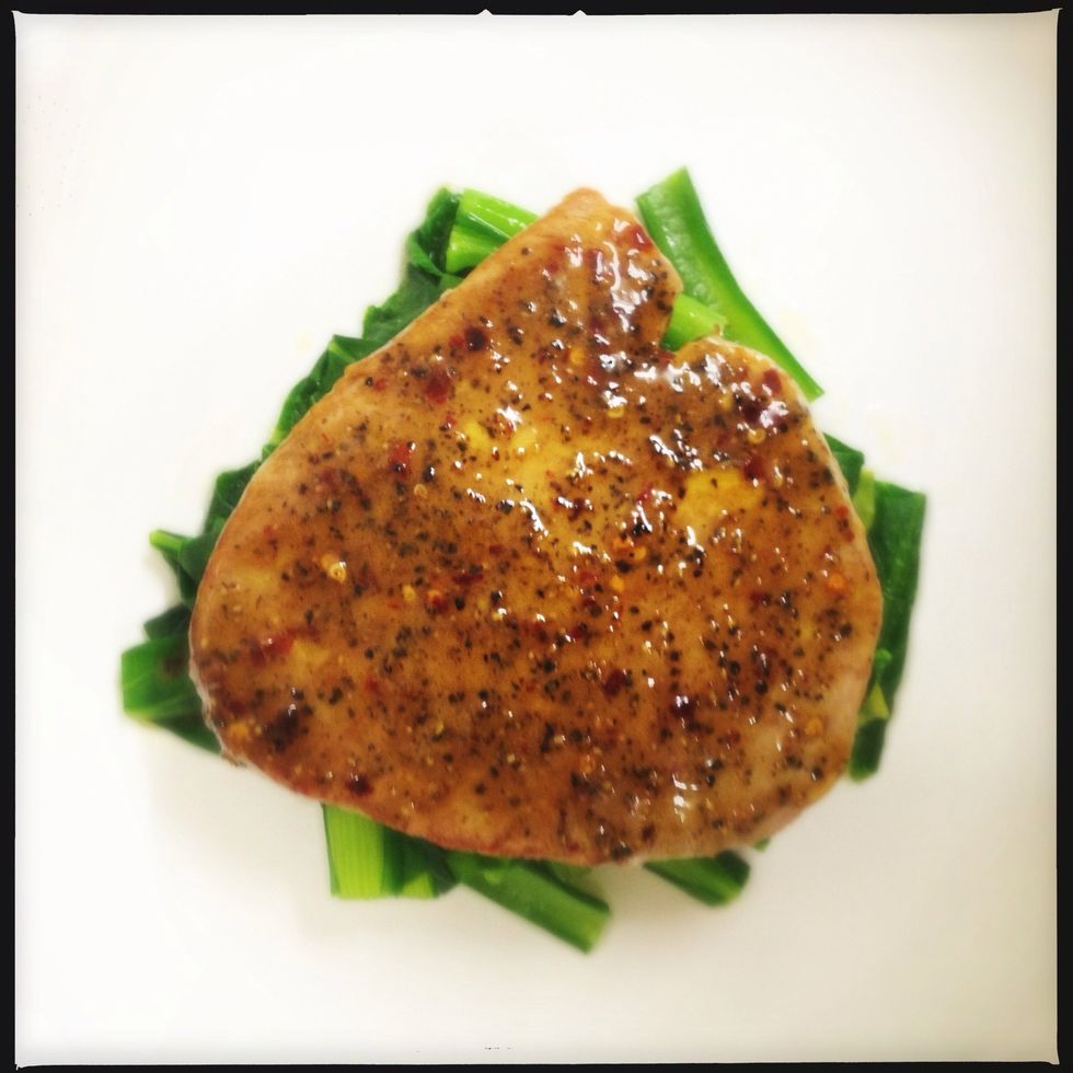 After another minute, pull out your tuna and spoon over the lime and black pepper sauce. I like to serve mine on a bed of choy sum; serve with whatever you fancy!