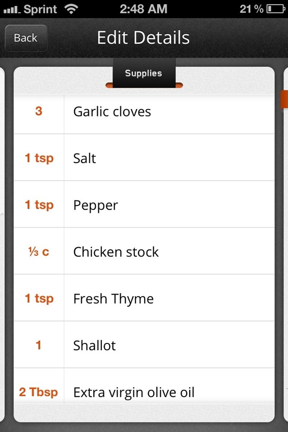 Gather all your ingredients together and begin prep work. Start with dicing your onion and 3 cloves of garlic. Remove the tiny leaves off of the stem to make 1 tsp of thyme leaves.