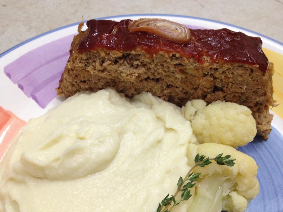 Slice a few shallots to garnish the top of the meatloaf. Place the shallots on top of the ketchup glaze. Then put the pan of meatloaf in a preheated oven to bake for one hour at 325 degrees Farenheit.