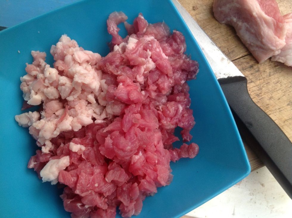 Don't forget to fill the bottom of the steamer with 1/3 of water, bring it to boil. Grease the layers of the steamer disks with some oil (to prevent the dumplings from sticking)