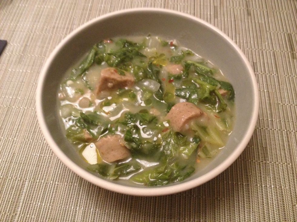 Add the vegan sausage and simmer for another couple of minutes. Depending on how tough your greens are, you may need to cook for a longer period of time. Adjust the salt and pepper to taste.