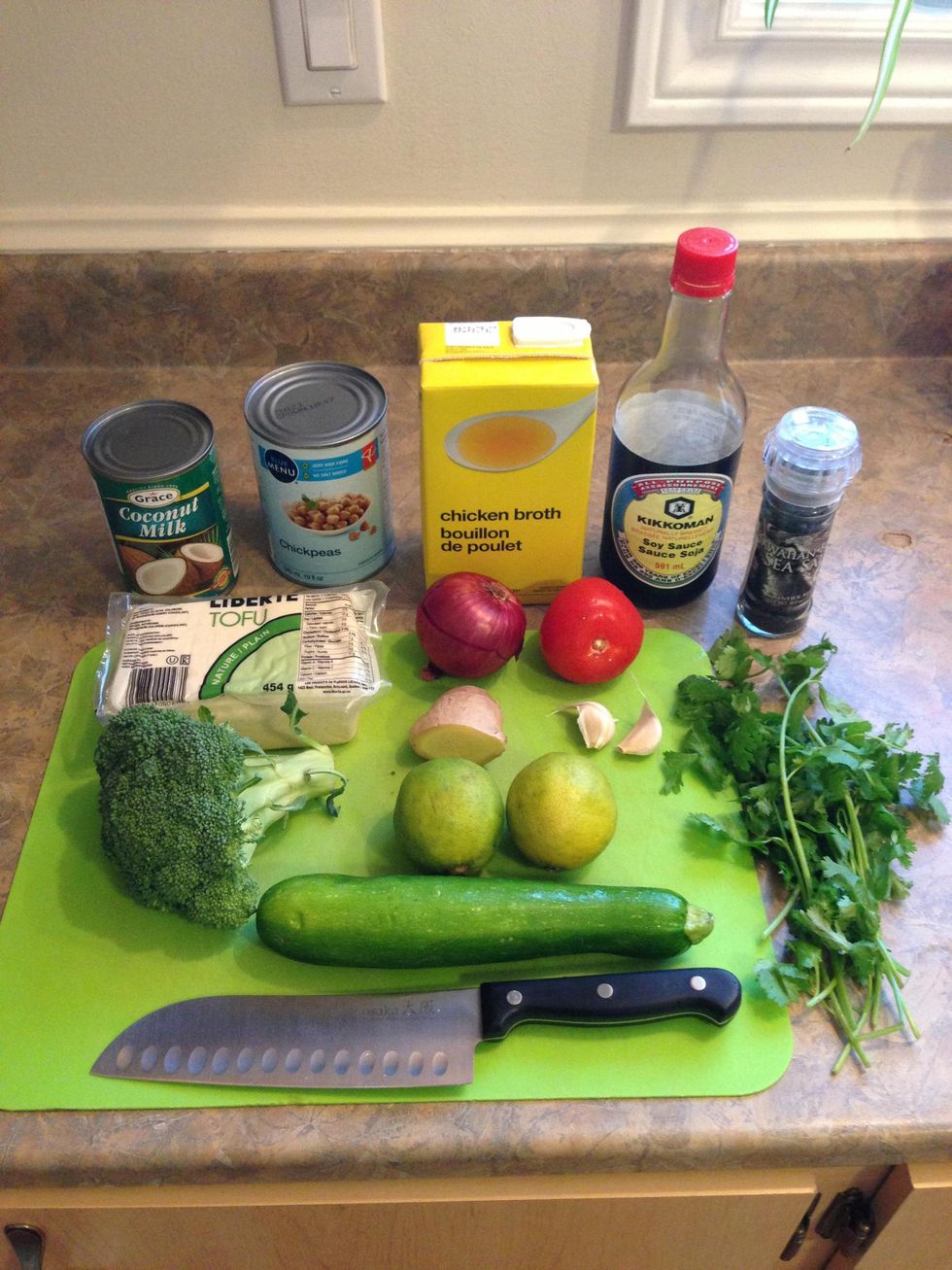 Chop zucchini, tomato, tofu. Cut broccoli into florets. Halve your limes.