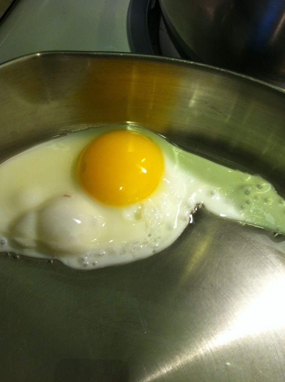 On the same heating setting as before allow the egg to heat up and turn white Note the oil is till coating the bottom of the pan! That shows you the pan is not that hot