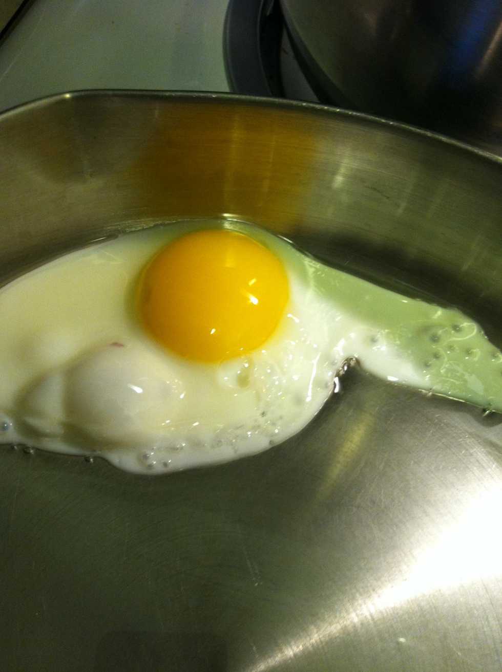 Spray the pan with PAM cooking spray, or olive oil. Make sure it covers the entire pan you never know what side of the pan the egg with stay in