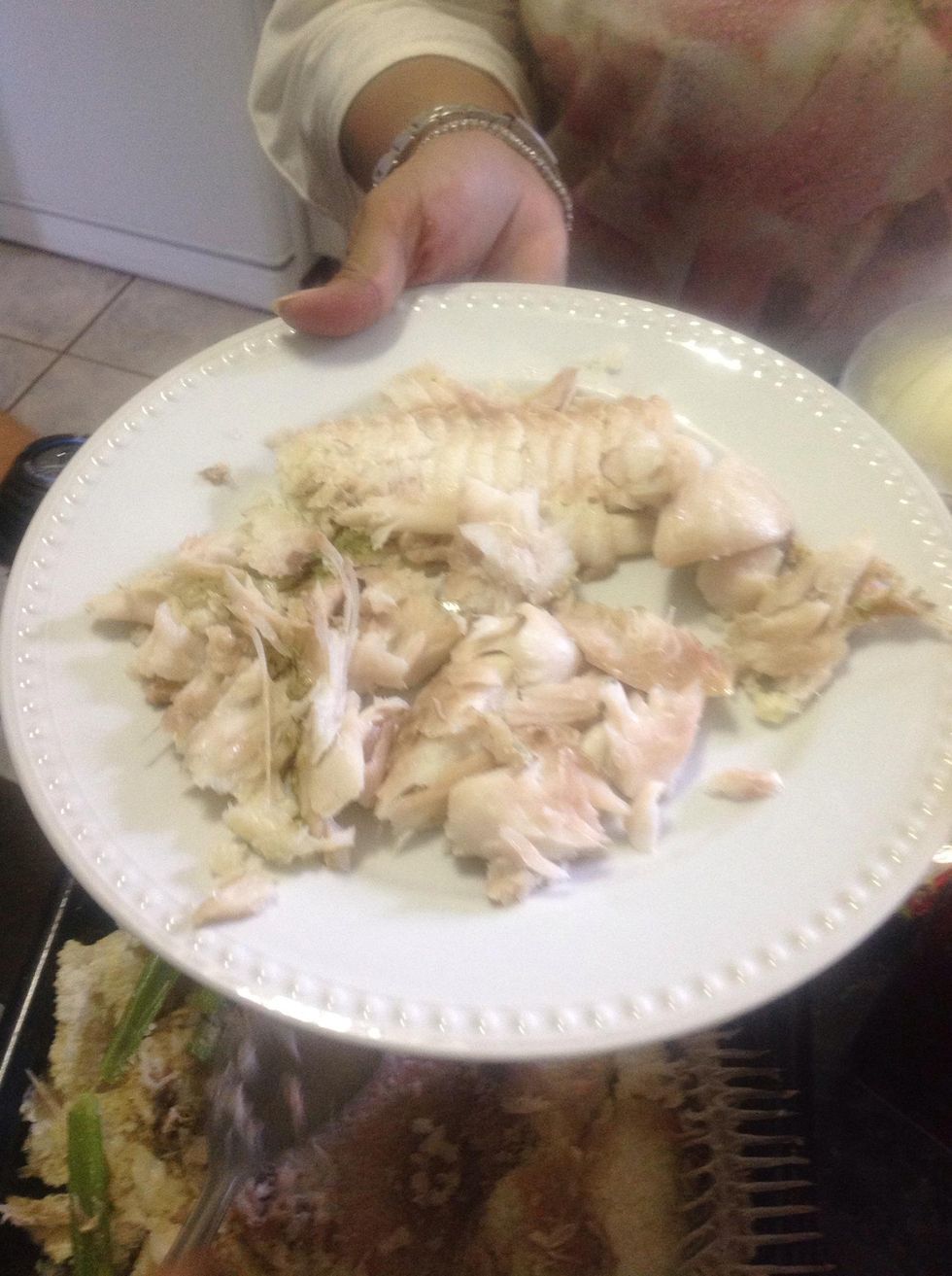 Bake fish in a pre heated oven. I baked this fish on 180 deg/cel for 25 minutes. Remove from oven and crack the crust and lift off the flesh inside.