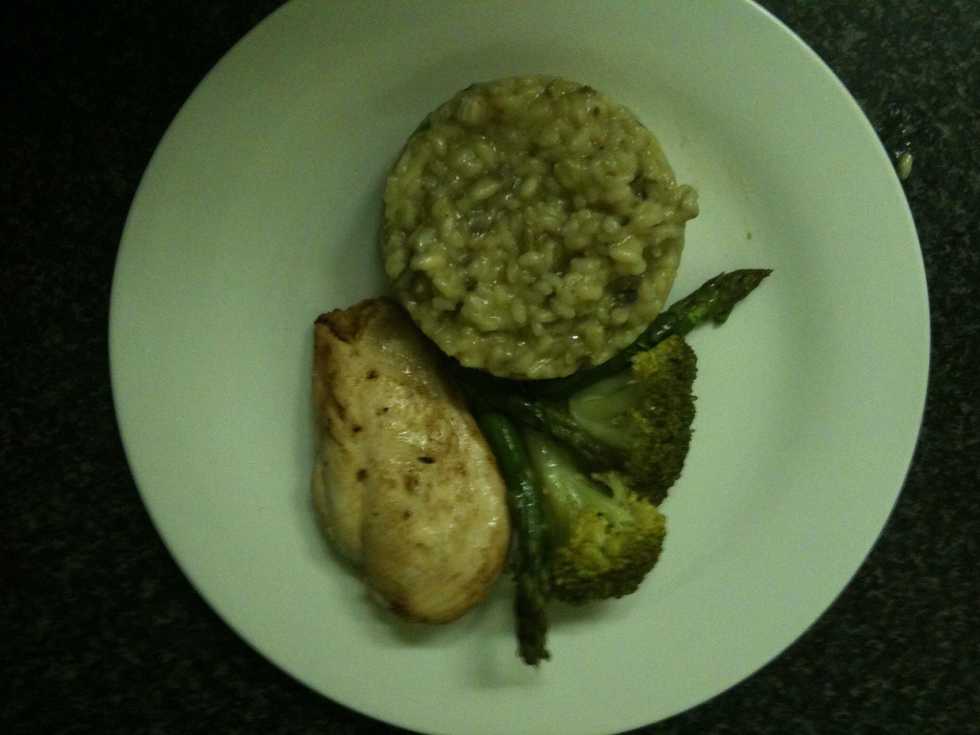 As the rice softens add the mushrooms and asparagus, a spoon at a time when adding stock