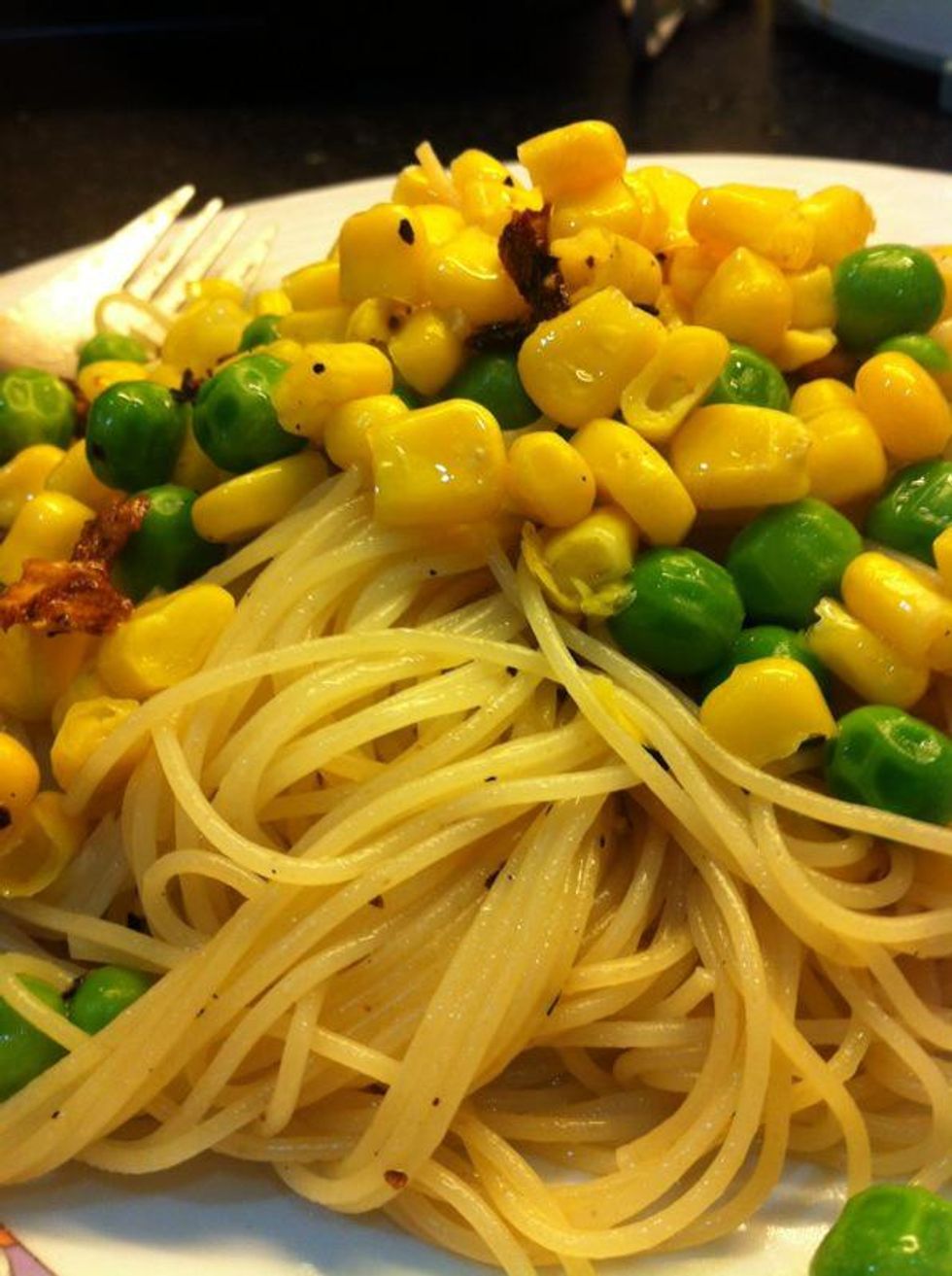 Preparation: Boil water, smashed garlic taste the same as chopped and takes twice as less time. Boil spaghetti, peas, sauté garlic all at the same time