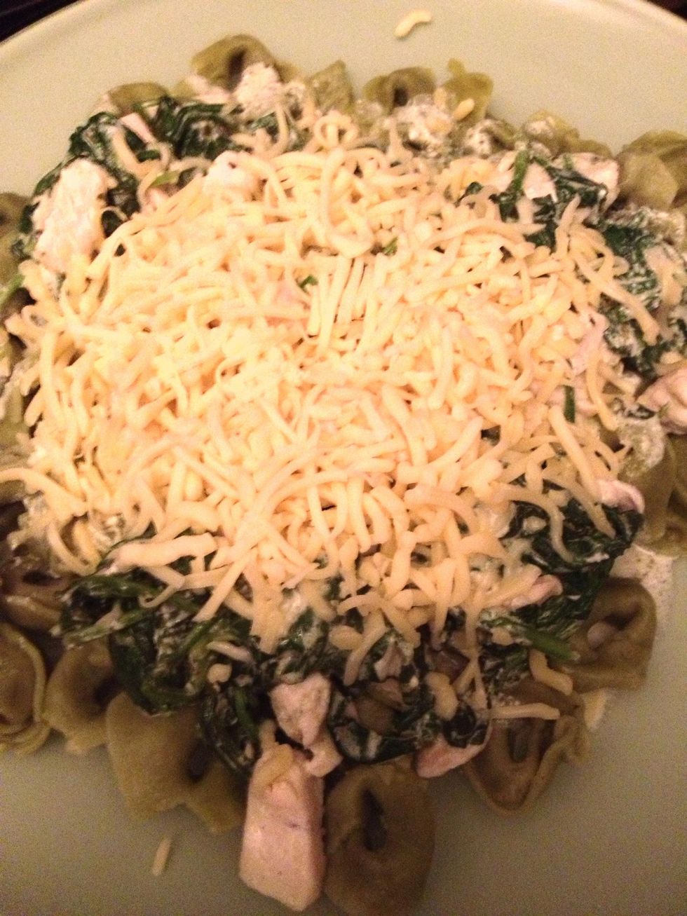 Drain your pasta and put the amount you want on a plate. Throw the chicken, pesto, creme fraiche, spinach mixture over it and your D O N E !!