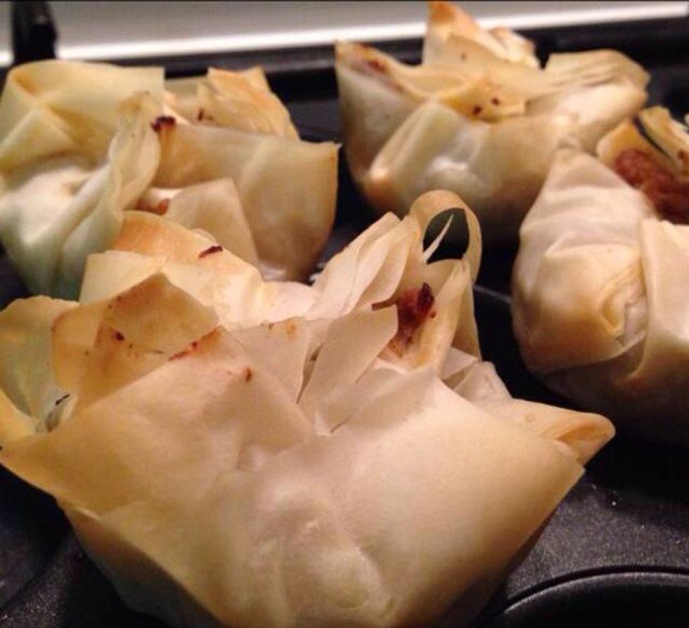 Cut the pastry into squares slightly bigger than your muffin pan (greased with butter). Place the pastry in your pan and add your filling until only the four corners of the pastry square are uncovered