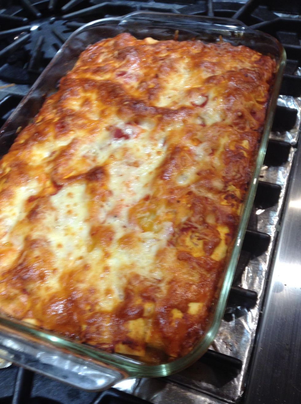 Add final layer of pasta, remaining sauce, sprinkle with shaved parmesan, mozzarella and asiago. Bake at 325F,