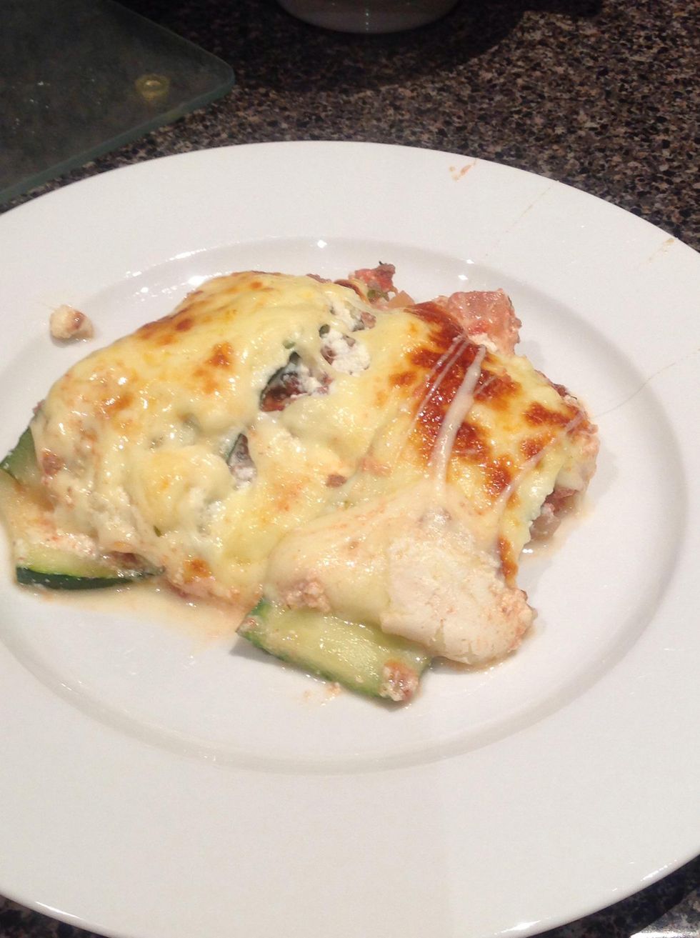 Grill zucchini. Layer dish with meat sauce, then zucchini, then...