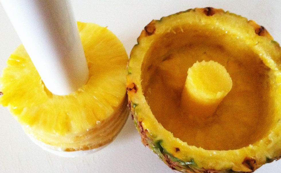 Squeeze the pineapple and collect the juice. This can be used for a piƱa colada or for freezing slices and chunks.