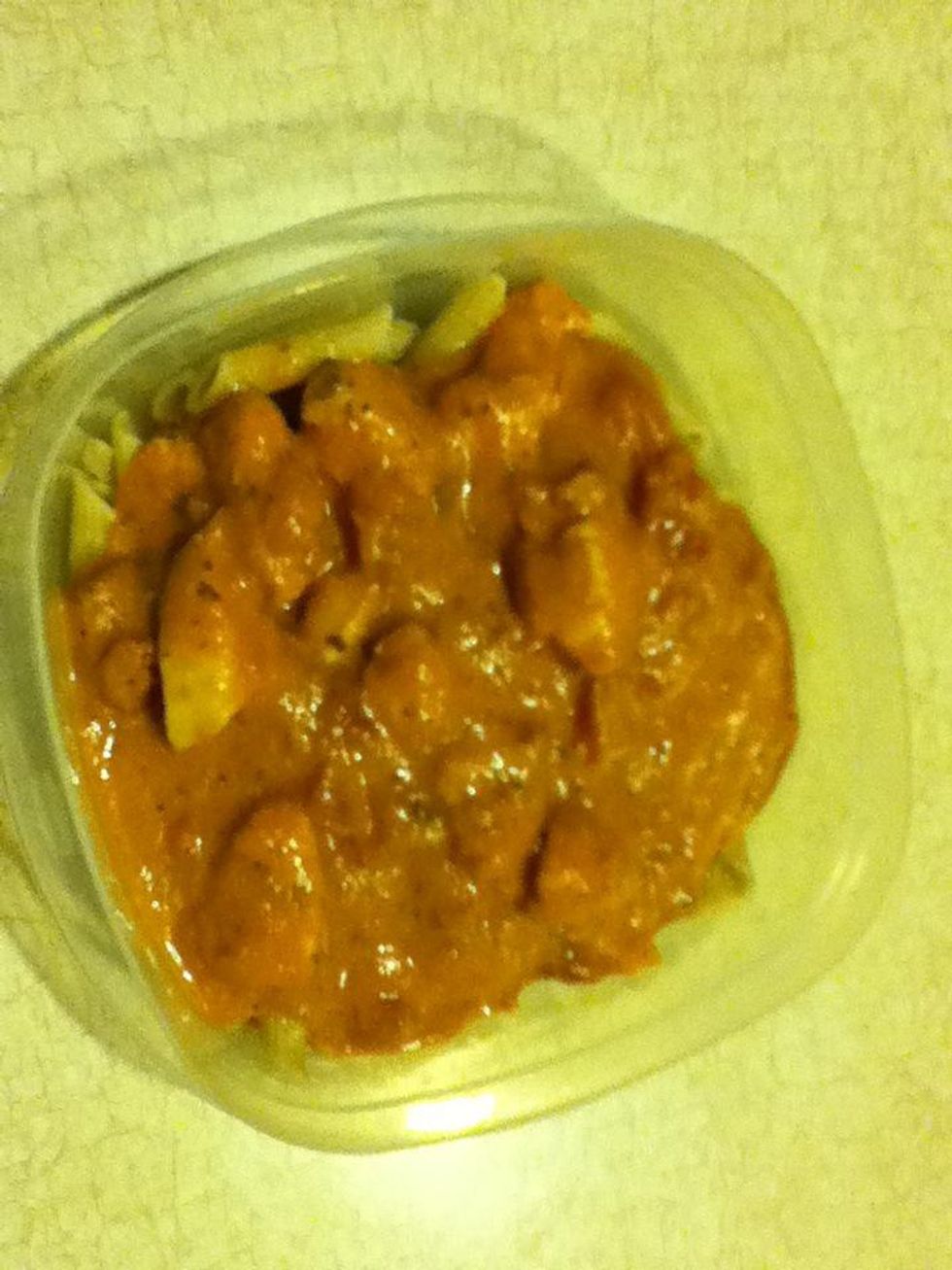 Cut and fry chicken in 2tbs olive oil.Add 1 can diced tomatoes.Add 1 jar of prego spaghetti sauce.Add 8oz sour cream.Add half cup of fresh grated Parmesan.Serve over your favorite noodles.