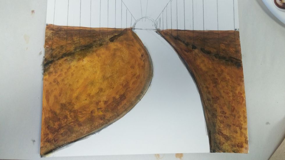 USe the richest base color for the trunks. Follow the guidelines to place the trunks of the trees on both sides