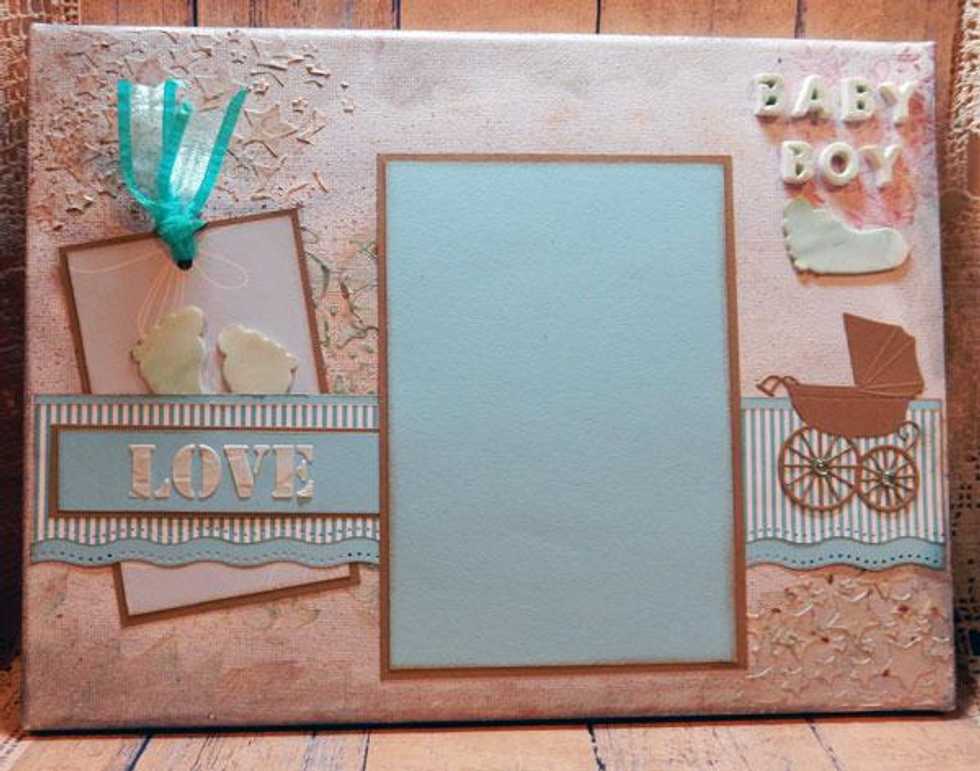 Add cardstock and pattern paper strips across the canvas. Add a photo mat. Use the Soliloquy Stencil to spell out LOVE. Punch 3 feet from the thin strips of clay and adhere to the canvas.