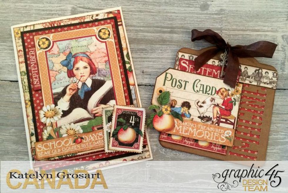 Adhere the September word 1/4" from the left of the tag and 1/2" from the top of the children border. Use foam squares to adhere post card slightly over the apple border and underneath the September.