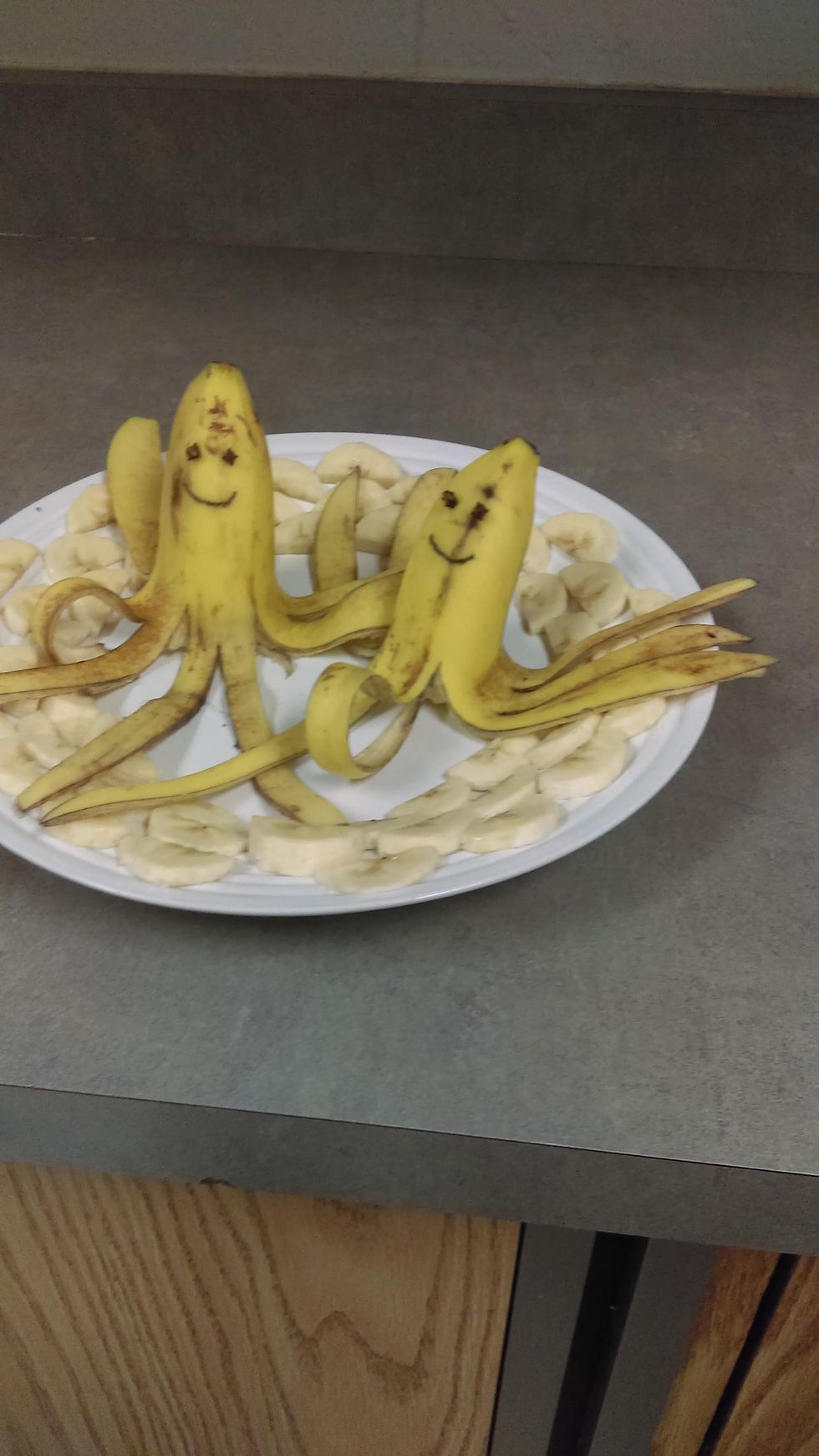 Peel a banana partially, leaving the unpeeled part for the octopus head.