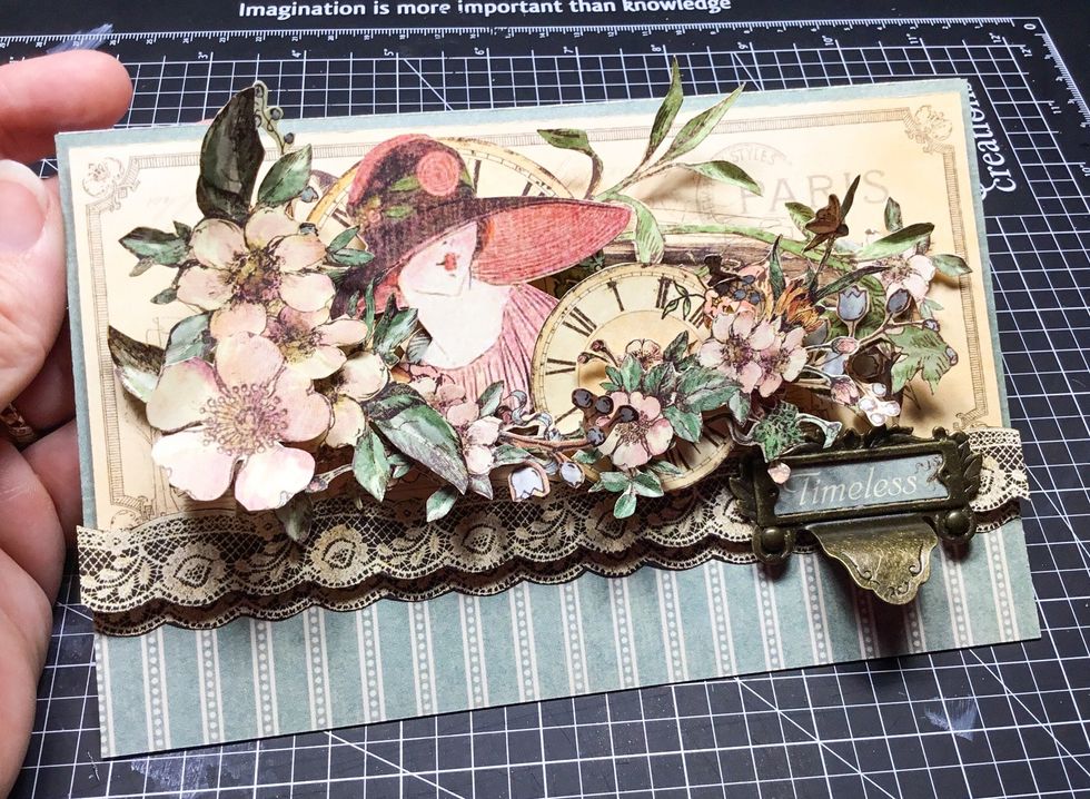 Locate and fussy cut images shown from A Ladies Diary patterned papers. The folded card size is 7" x 4 1/2" this was made from contrasting cardstock.