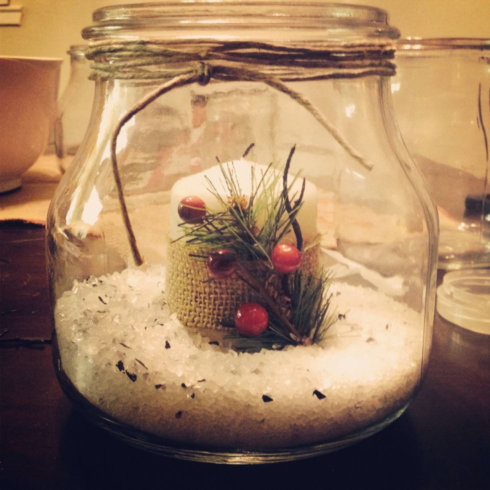 One dry I nestles my candle with the burlap and greenery into the Epsom salt and glass combination and TaDa! A beautiful simple Christmas centerpiece. Enjoy!