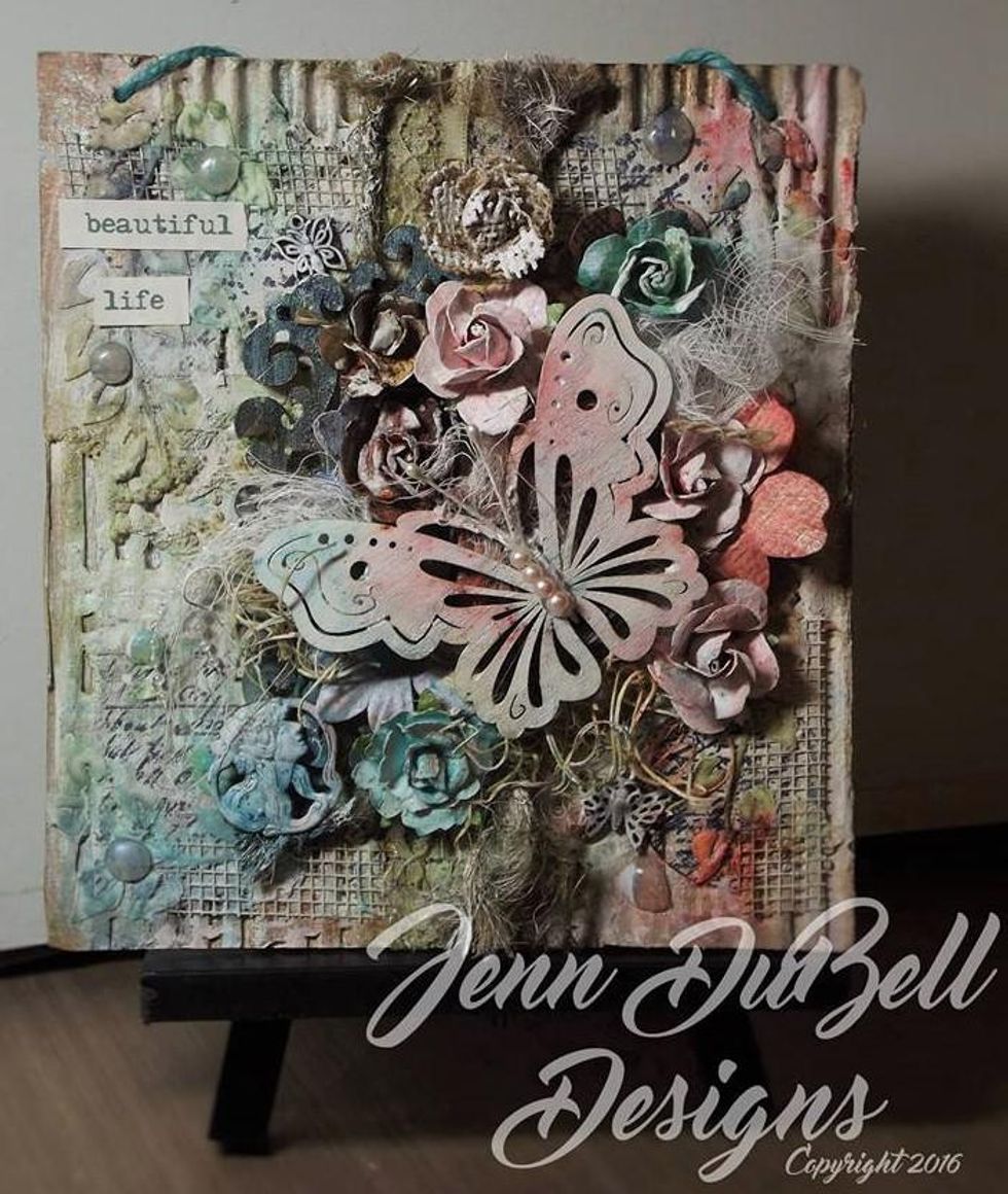Add your florals, embellishments, and focal point piece like the butterfly here. I then swiped white gesso lightly in some areas and over florals.