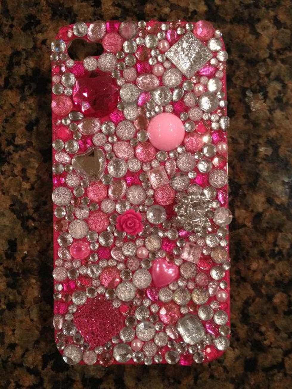 To get started you want to plug in the hot glue gun and let it heat up. Then you might want to lay out your jewels and phone case