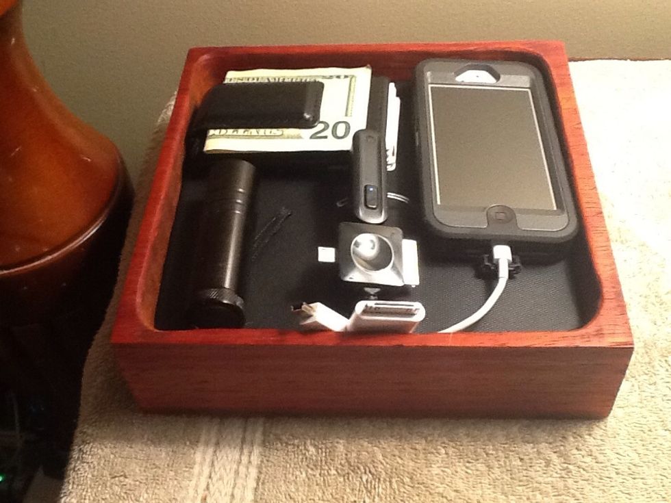 The electronic valet chargers all my devices, holds my wallet and a small flashlight.
