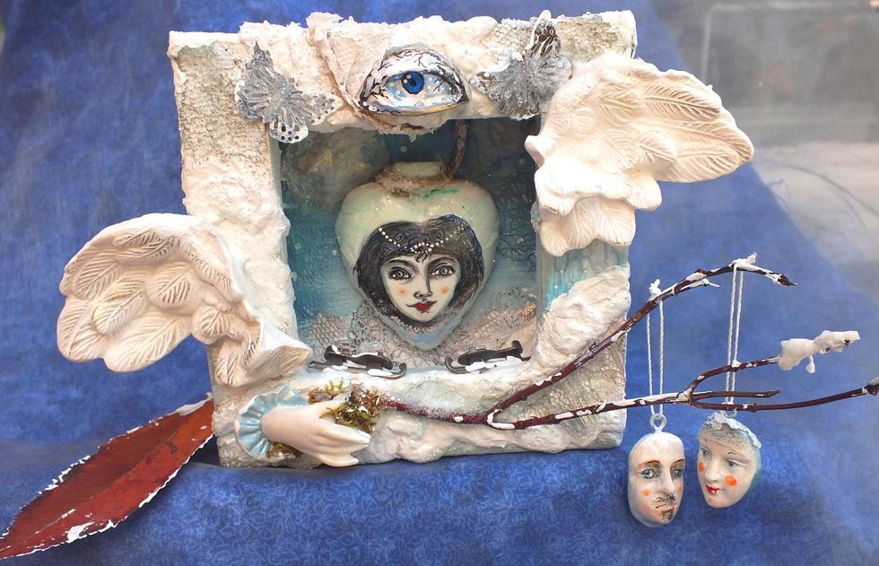 Fix your relics onto your canvas with a heavy gel medium. finish of snow and ice with Gesso and Bead Gel. Paint the hand with a light touch of acrylic, a pearl glaze & fix tufts of sheet moss