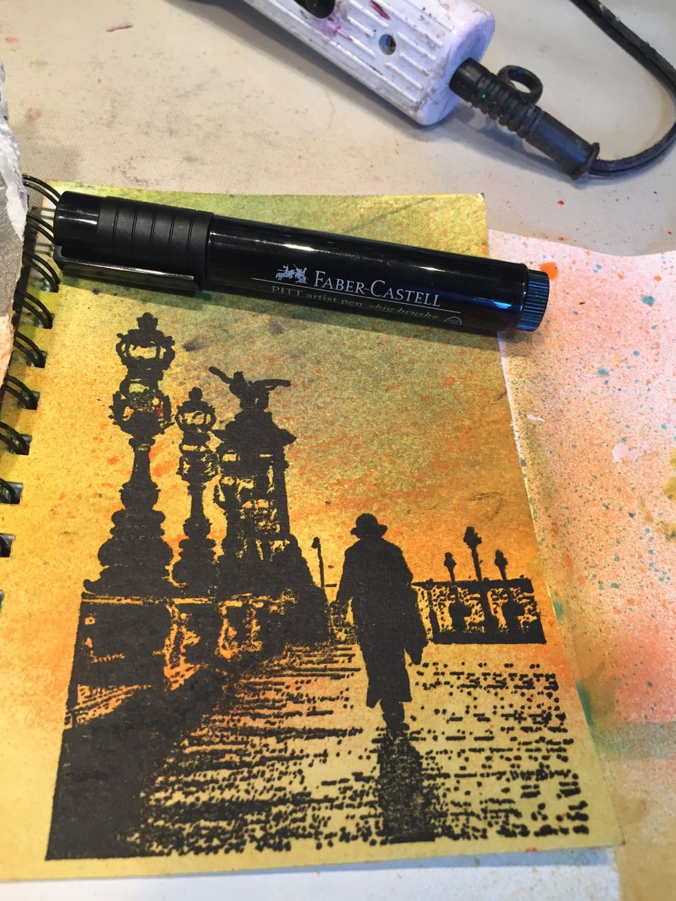 On the right side of your journal spread, stamp the Pont Alexander III stamp using Versafine ink.
