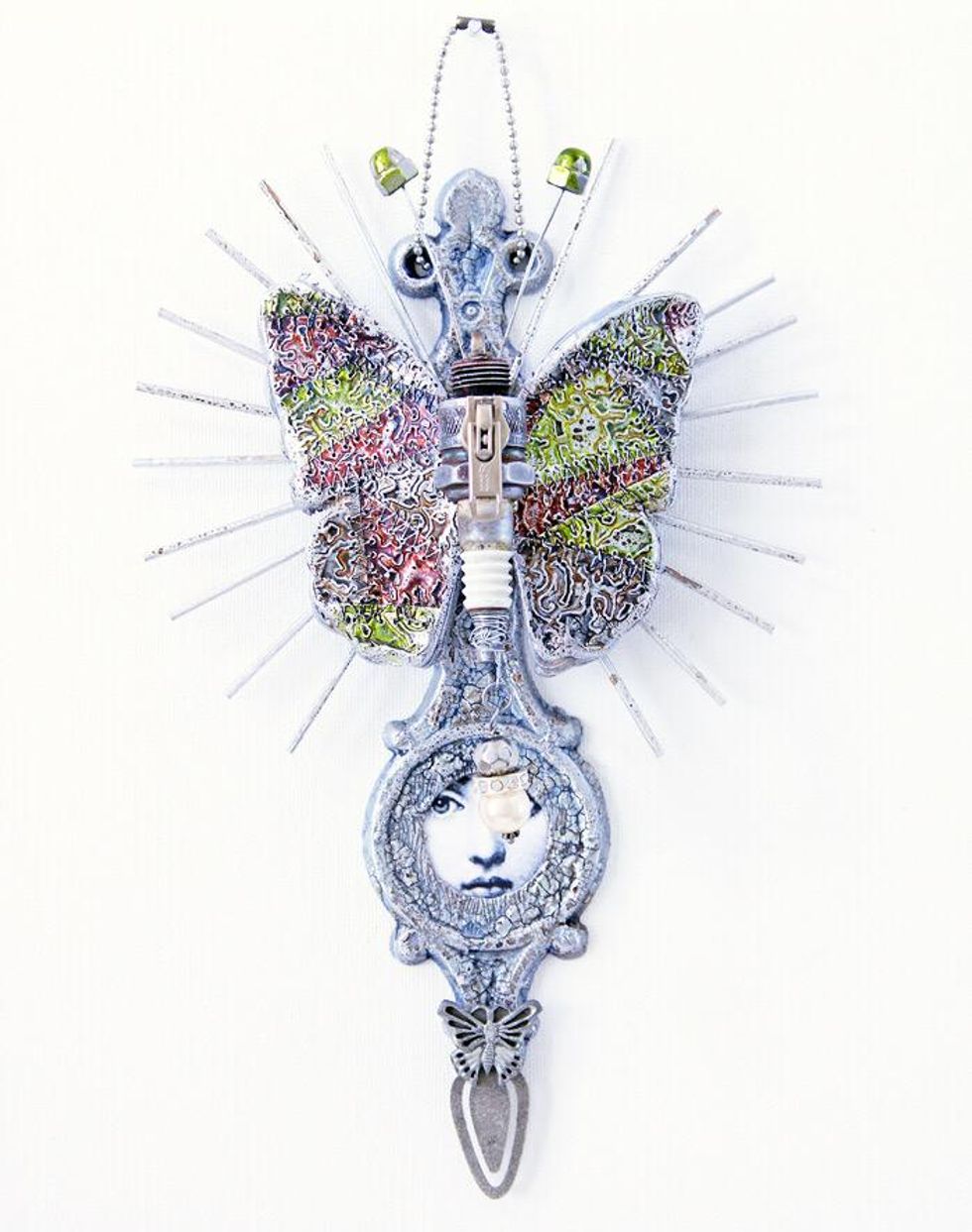 Gather vintage findings, finished Relics & Artifact butterfly, and painted metal piece. Assemble all pieces with E6000 glue to ensure they are permanently in place.