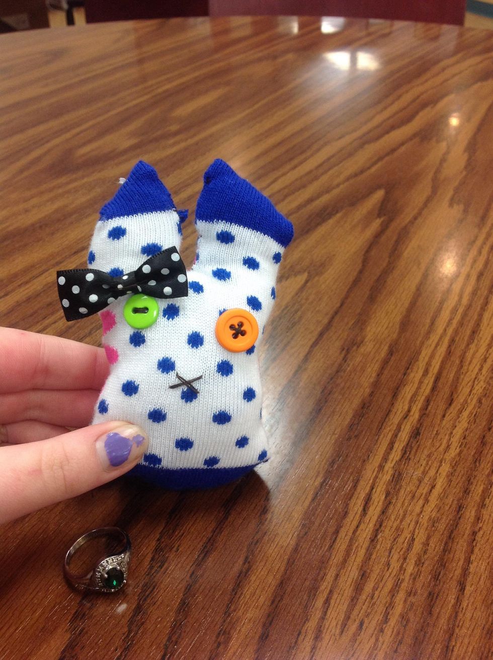 Flip the sock inside out and sew the cut toe area into "bunny ears"
