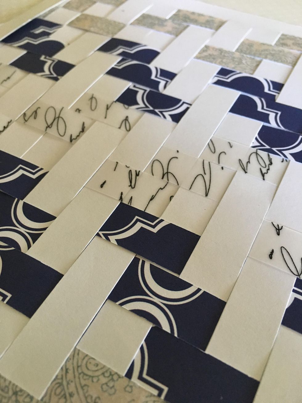 Take the first strip and working from right to left. Weave across the top of the first three vertical strips and under the next three and continue over three, under three until you reach the end.
