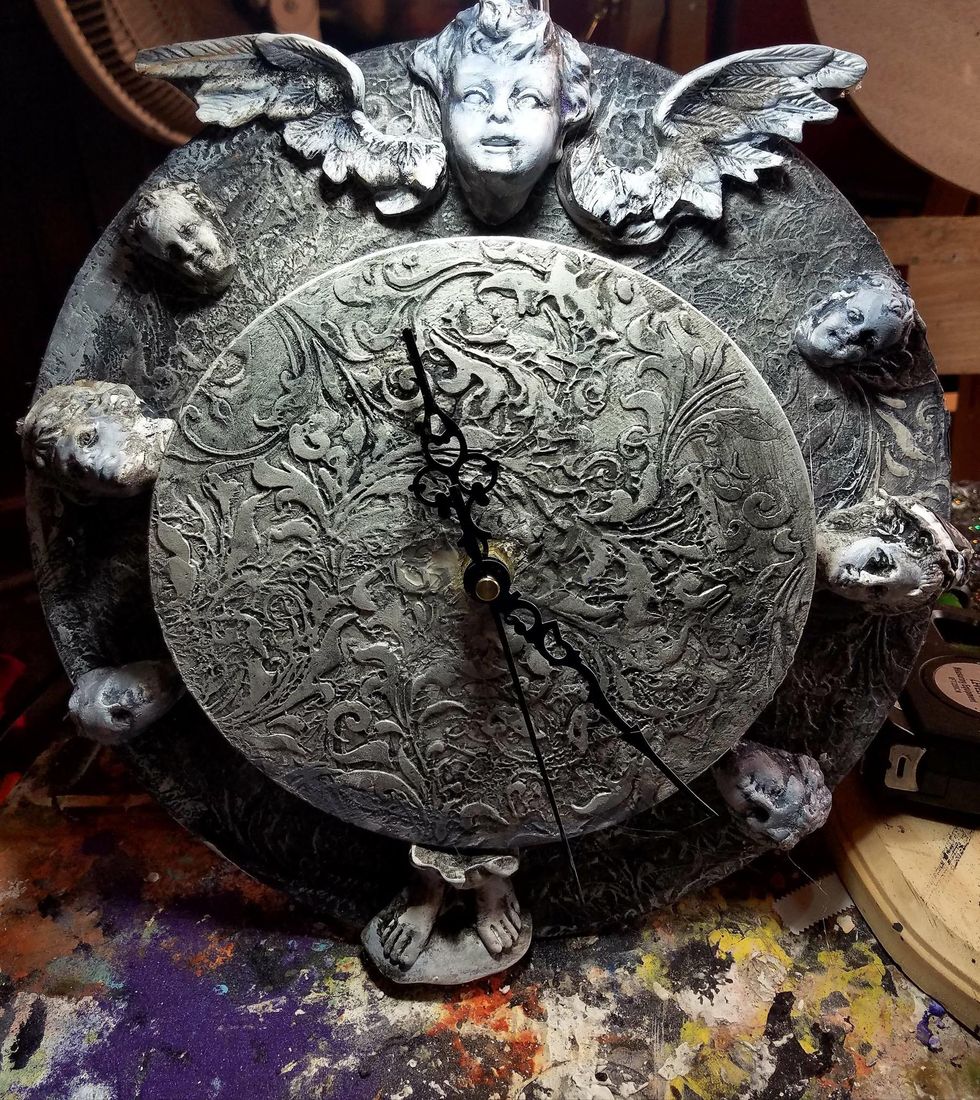 While still wet lay down filigree stencil pressing slightly and pull back up to make imprint replace around circle. Allow to dry As you do the exact same to the larger disc..minus the Cd Measure.