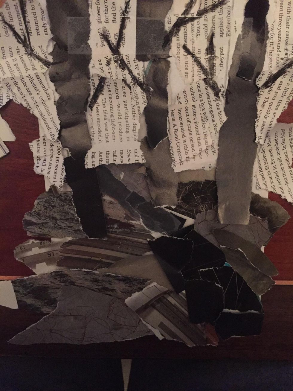 Fill the negative space with text (paper with words). Glue the paper so the words are going vertically up your paper. This will created the illusion of more smaller trees far away.