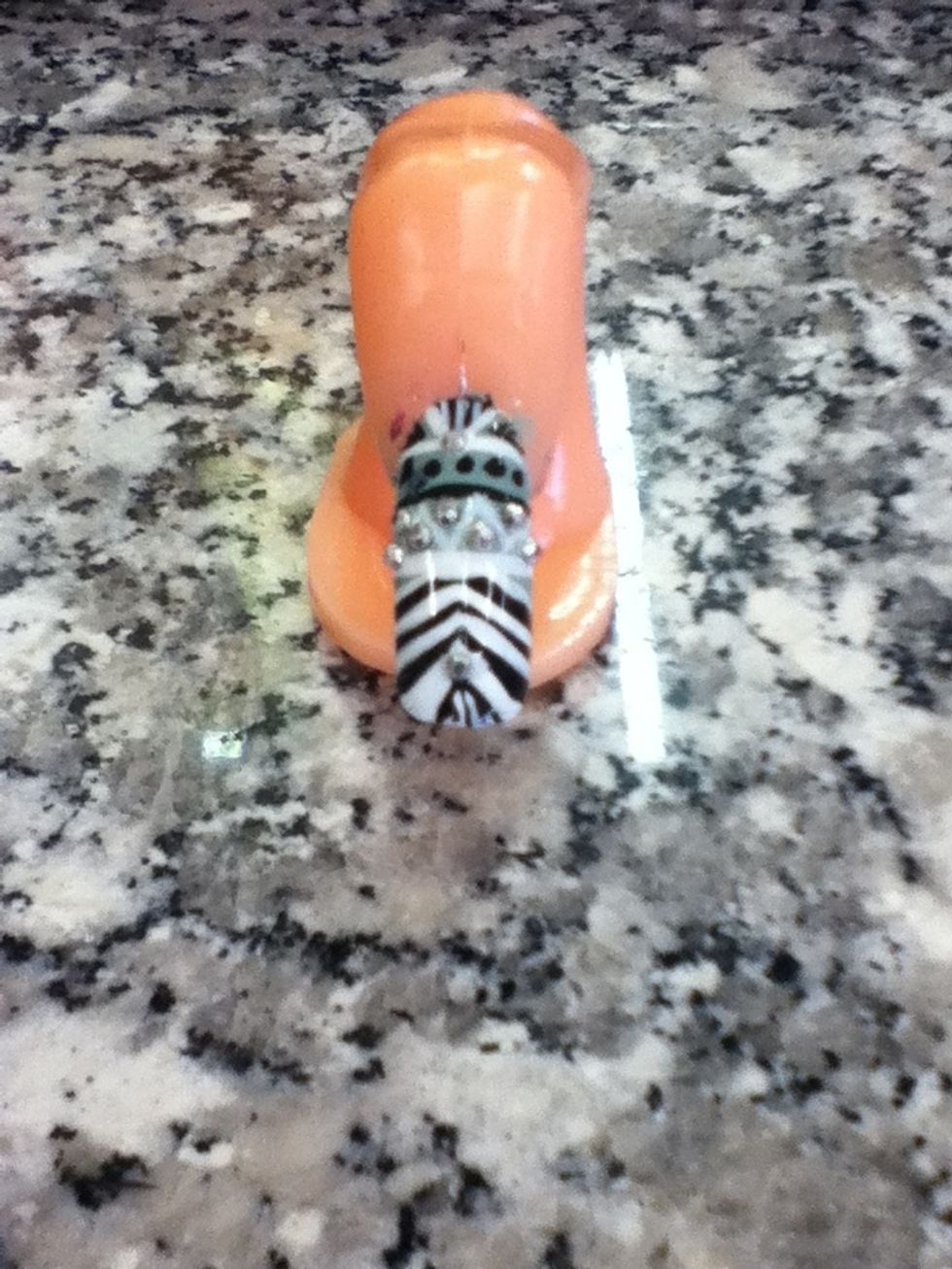 When your done with the lines then add the little silver beads bt the zigzagg's in between the lines then one on the top of the nail and bottom.