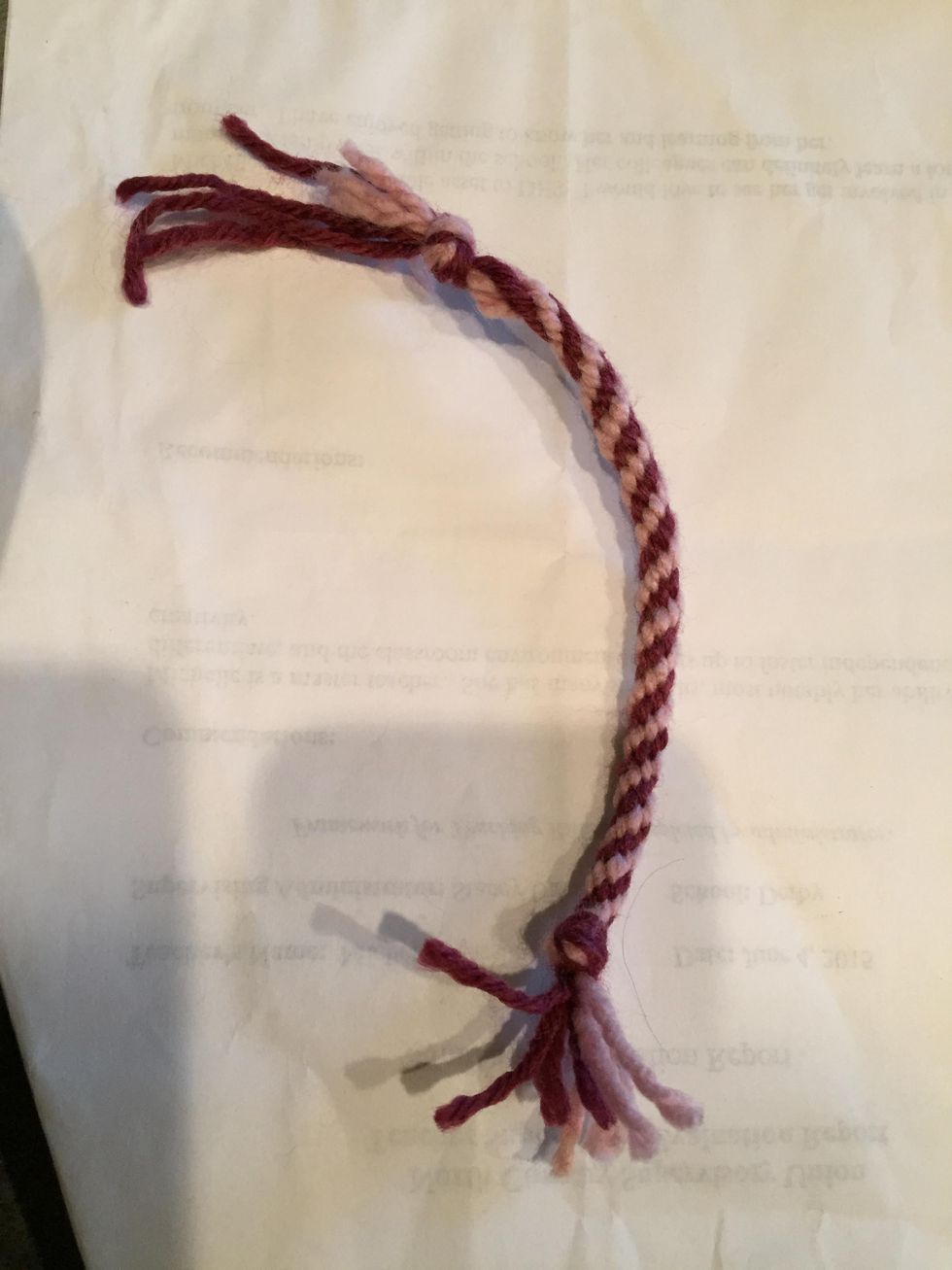 Choose 2 colors of yarn. Cut 4 strands of each color for a total of 8 strands. Each strand should be about an arms length.