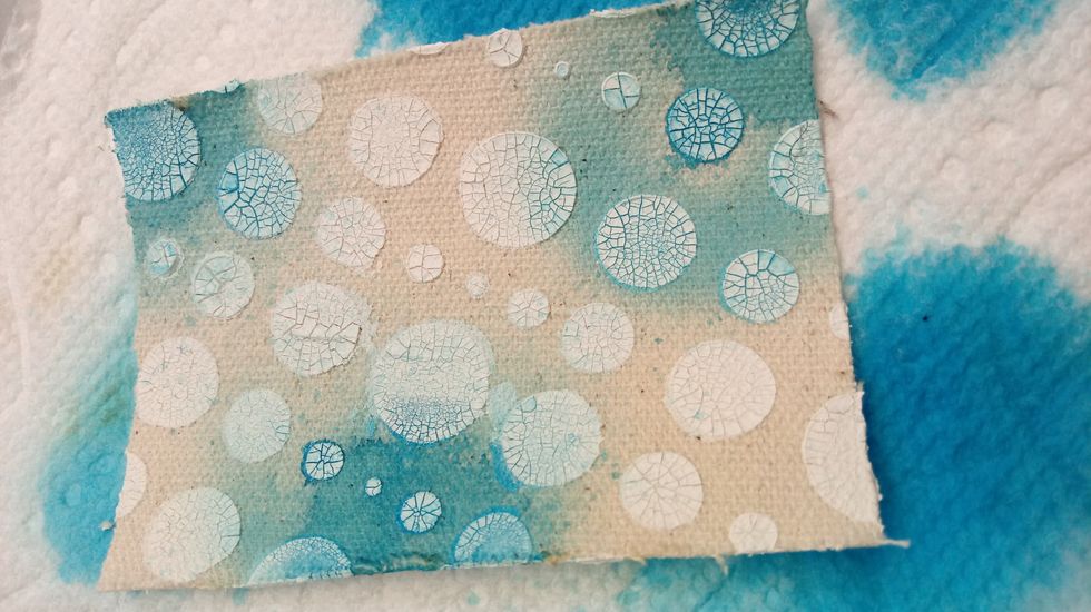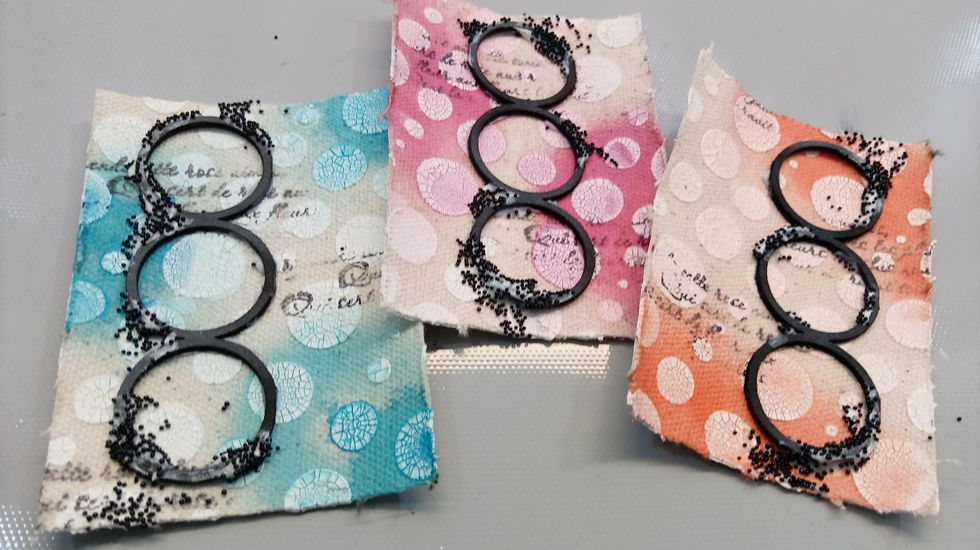 I started out with pieces of Canvas for my ATC's Each one is 2.5 x 3.5 inches in size. I used texture paste with my BUBBLES Stencil to create texture.